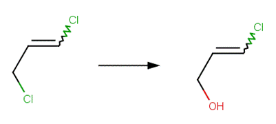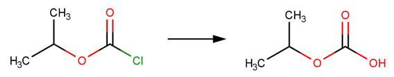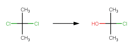 ·         2,2-Dichloropropane (Ellington et al, 1988) Reported products are 2-chloropropene (due to elimination) and acetone.  The example shown below, with formation of 2-chloro-2-propanol, is the first step in the formation of acetone.  2-Chloro-2-propanol is hydrolyzed according Nucleophilic Substitution Scheme A to 2,2-propanediol, which is a geminal diol that rapidly undergoes dehydration to form acetone.