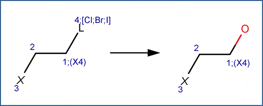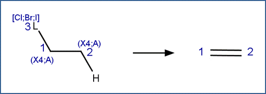 This scheme also includes a selectivity rule to indicate the order of removal of halogens for molecules with different halogen substituents.  The order of removal of the leaving halogen (labeled reactant atom 4 in the scheme) is inverse to its atomic number, i.e., I>Br>Cl.  This is due to the fact that the carbon-halogen bond strength is greatest for the most electrophilic halogen.  (Larson and Weber, 1994)