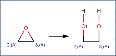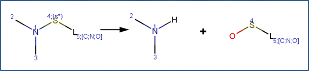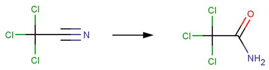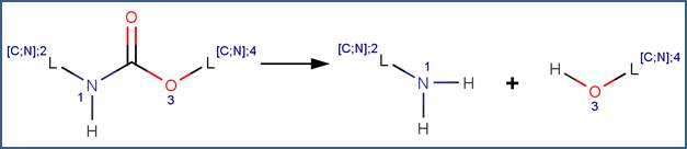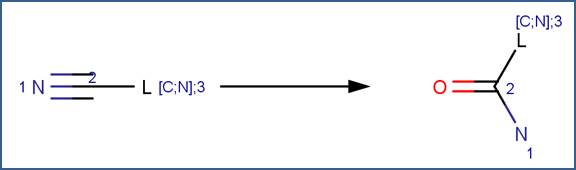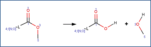 The reaction schemes are written as generic reaction equations defining how a particular structural fragment will be modified by the transformation reaction.  These schemes are not balanced reactions showing all reactants and products (e.g., H2O, OH- and/or H+ are not shown as reactants in the hydrolysis schemes).  Additionally, the structural fragments in the reaction schemes are written with a minimal amount of specificity.  For example, the inclusion of hydrogen atoms in the scheme implies that there is a requirement for a hydrogen atom to present be in the specified position for the reactions to proceed; otherwise, it is assumed that, for simplicity, hydrogen atoms are not explicitly included.