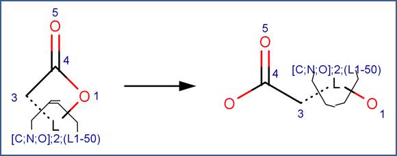 The schemes are encoded using the notation and structural query features (L, ~L, L1-X, etc) from ChemAxon’s Marvin tools.  Definitions of some common symbols used in the reaction schemes are provided below: