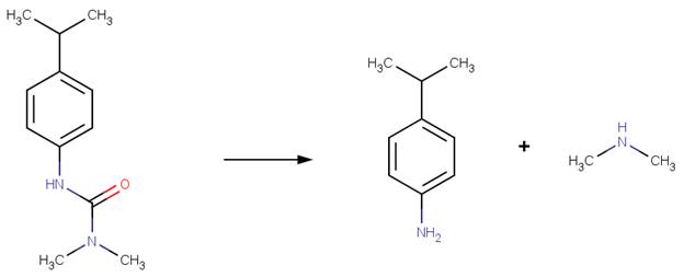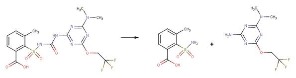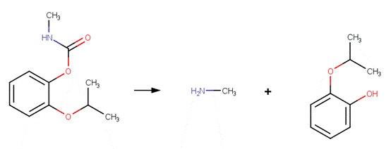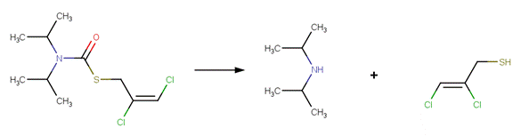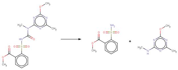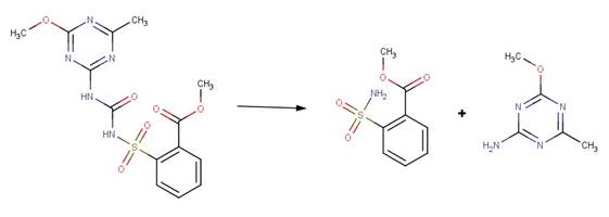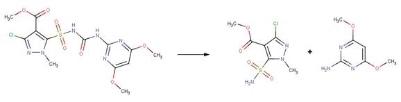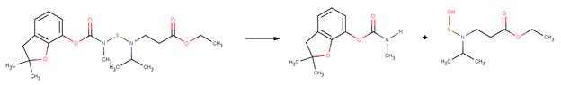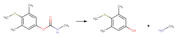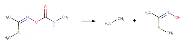 ·         Thiodicarb (EFSA, 2005c) The only major reported hydrolysis product of thiodicarb is methomyl (shown below).  This product forms after two sequential N-S cleavage reactions.  The first N-S cleavage results in a hydroxysulfanyl intermediate, which undergoes a second N-S cleavage reaction to form methomyl.  The hydroxysulfanyl intermediate was not reported as an observed product in hydrolysis studies.