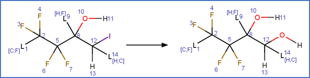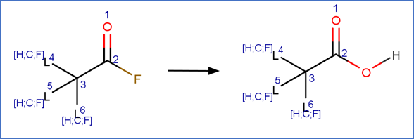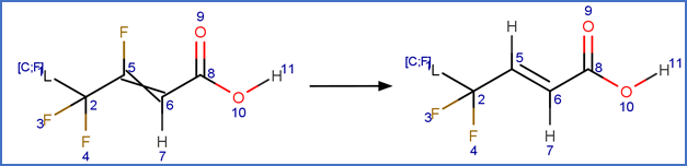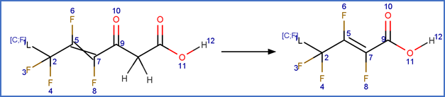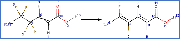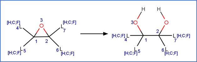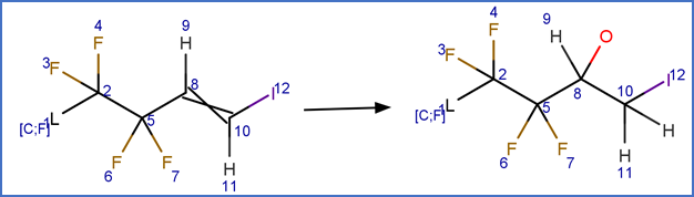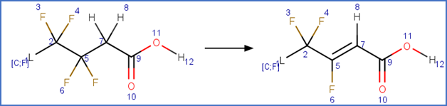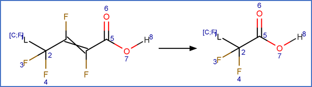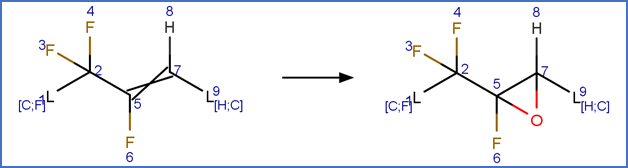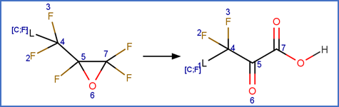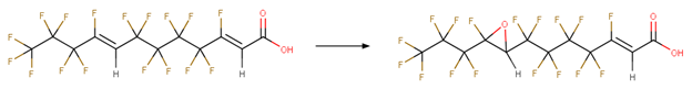 This scheme includes an exclude rule to prevent epoxide formation at the carbon-carbon double bond adjacent to the carboxylic acid group in beta fluoro unsaturated telomer acids or the carbon-carbon double bond adjacent to the aldehyde group in beta fluoro unsaturated telomer aldehydes.