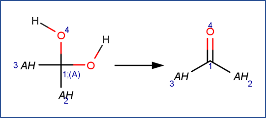 This scheme is actually an equilibrium reaction between a geminal diol and a carbonyl compound; however, the carbonyl compound is dominant, except in the case of simple aldehydes (e.g., formaldehyde) (McMurry, 2011, p. 731). It is necessary to include the dehydration of geminal diols to correctly predict the observed products in many hydrolysis and photolysis studies.