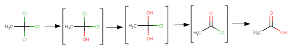 The first two steps in this scheme are hydrolysis reactions that would be predicted by the Nucleophilic Substitution (geminal X) scheme in the CTS Abiotic Hydrolysis Reaction Library. The diol produced by these two sequential steps will quickly be transformed into acetyl chloride. The acetyl chloride will then be further hydrolyzed into acetic acid, as would be predicted by the Acid Halide Hydrolysis scheme in the CTS Abiotic Hydrolysis Reaction Library.